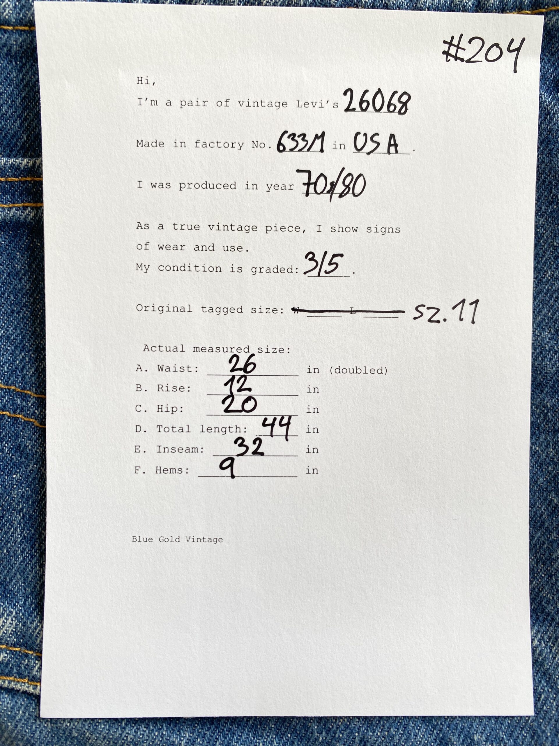 Disse jeans er et ægte vintageprodukt, produceret for mere end 40 år siden, før mange af de oprindelige Levi’s-fabrikker i USA lukkede, og produktionen blev flyttet til Sydøstasien. Som følge heraf bliver vintage Levi’s stadig mere sjældne og har potentiale til at stige i værdi over tid.